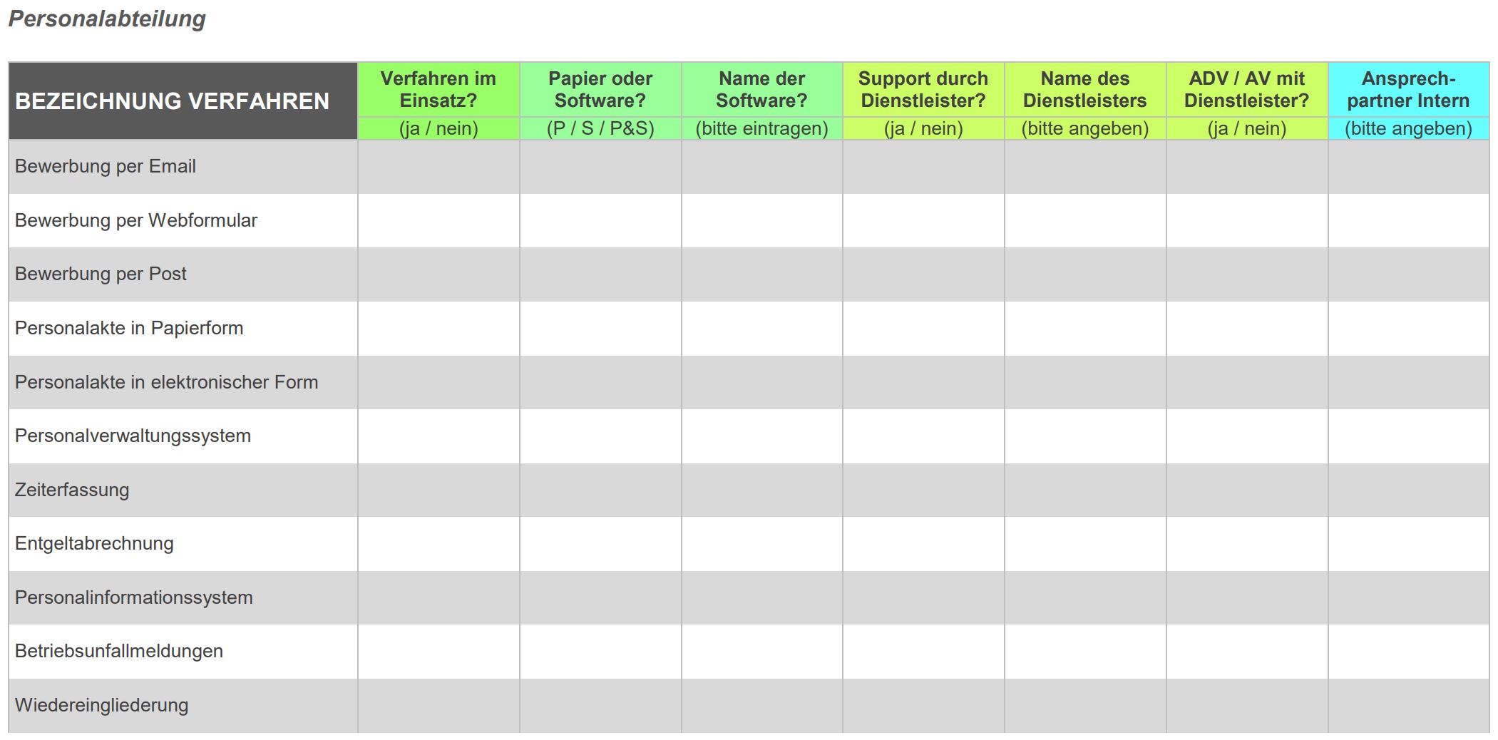 Beispiel Screenshot: Ansatzpunkte für Verarbeitungstätigkeiten im Bereich Personalabteilung