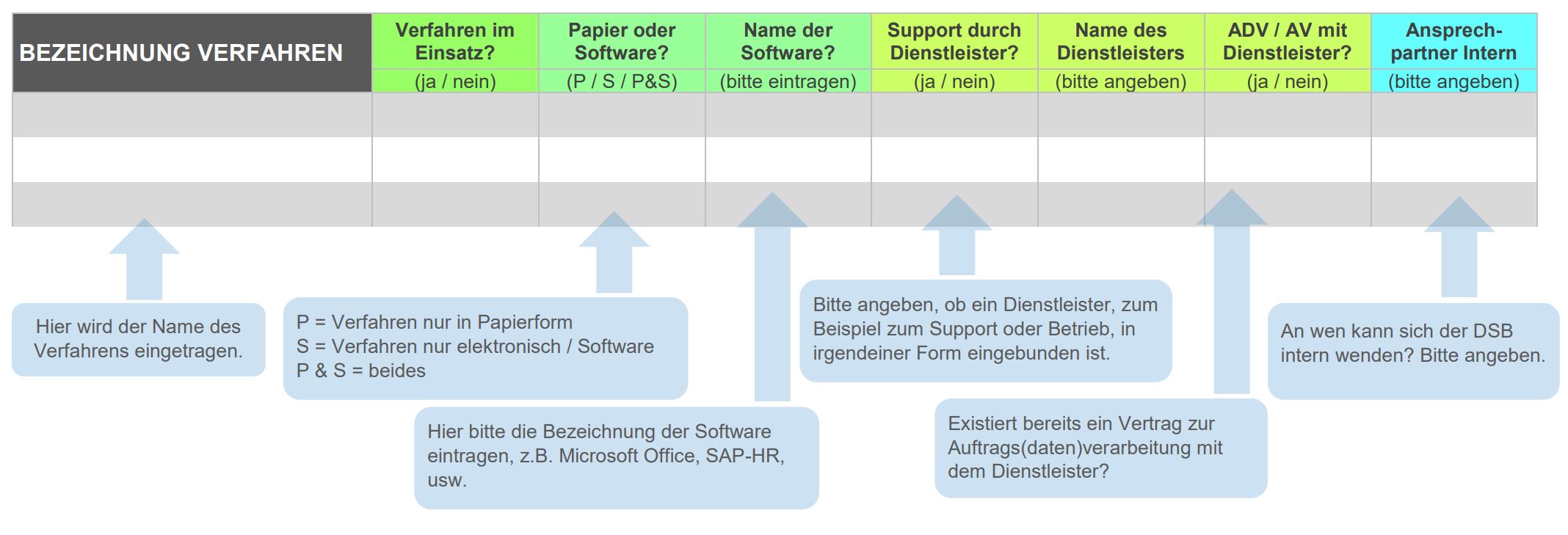 Mit unserer Übersicht gelingt Ihnen dieses Unterfangen mit Sicherheit und der erste Schritt ist getan. In unserer Übersicht finden Sie auch viele Beispiele für mögliche Verarbeitungstätigkeiten.
